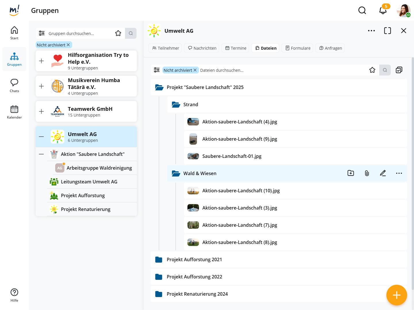 mantau Gruppen haben Teilnehmer und Funktionen. Und je Gruppe können die mantau Funktionen, z.B. Terminkalender oder Datenbox, individuell hinzugefügt werden, wenn benötigt. Das bringt Ordnung und Übersicht in Chats und Dateiablage.