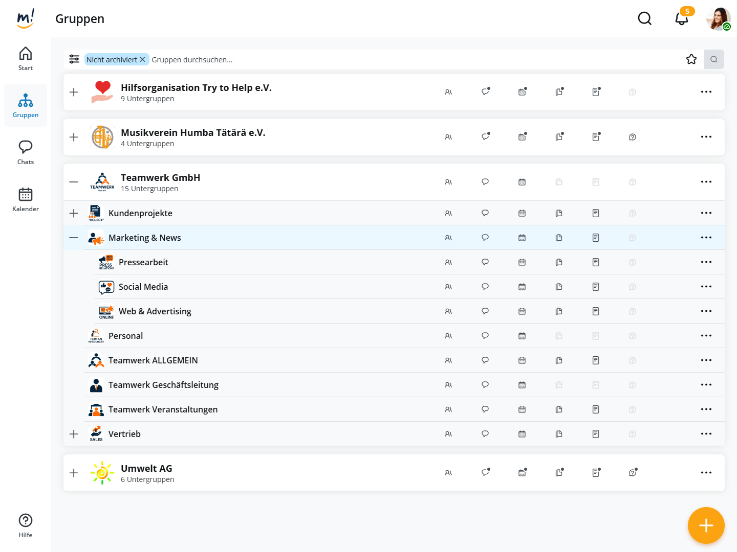Innerhalb von Gruppen lassen sich weitere Untergruppen bilden, je nach Funktion und Zweck. Ob nun für Teilmengen der Personen in der Hauptgruppe, z.B. einzelne Teams, Abteilungen o.ä. - oder für Themen, Projekte, Fachbereiche o.ä. Die Struktur können Sie sogar später noch verändern, komplette Gruppen lassen sich neu zuordnen.