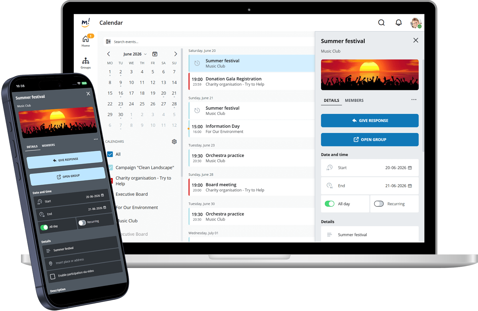 Administrators of a group create events for the group. This works easily and quickly, just like other calendars. Reminder functions included.