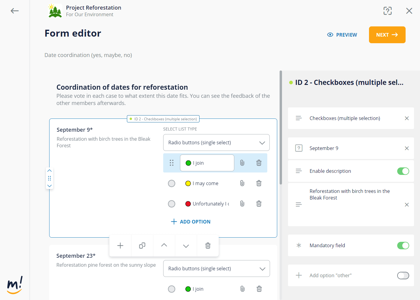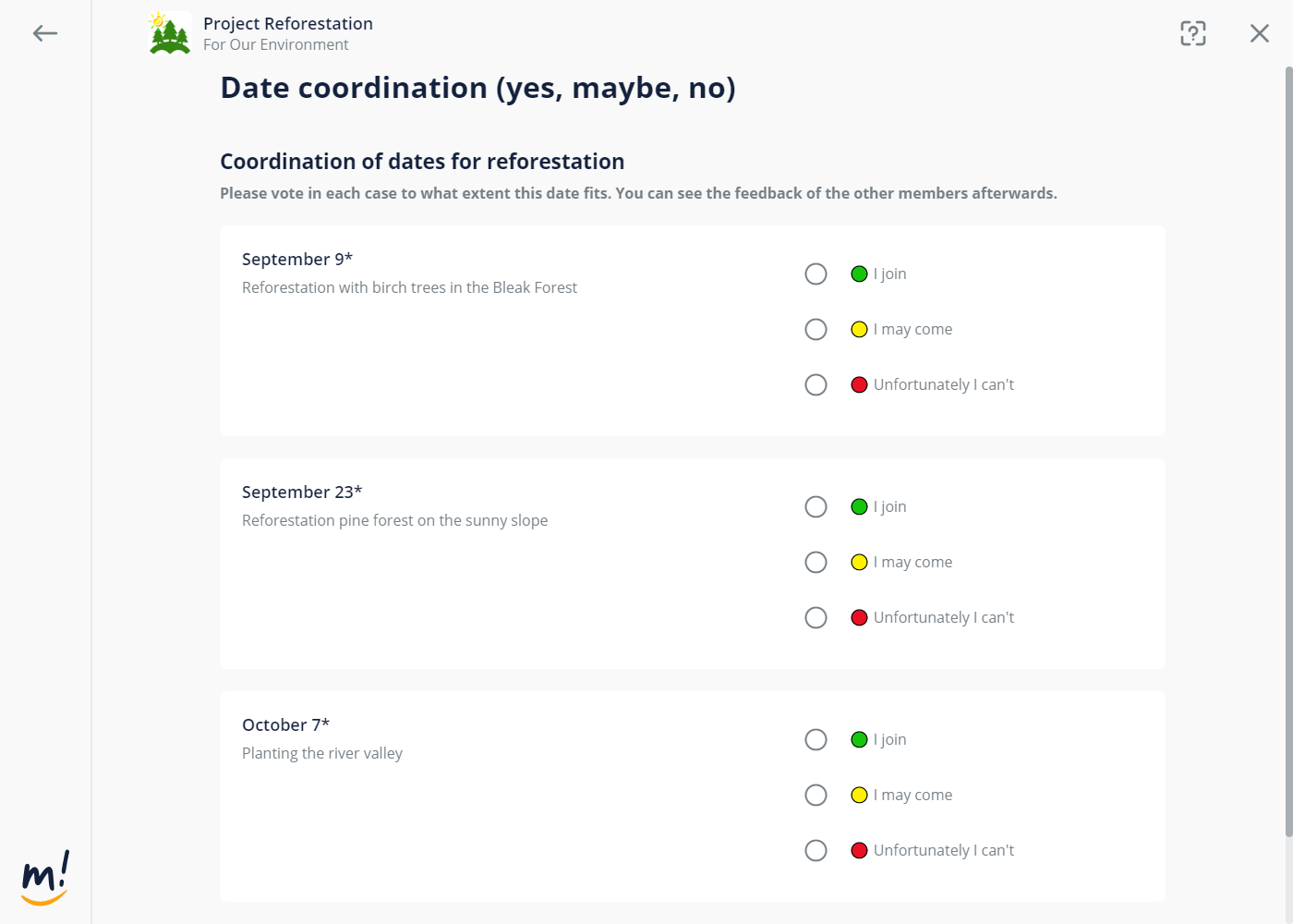 Forms made available to group members by the organiser for a limited time. Typically, they come with a call to all group members to fill in the form within a certain period of time. By using the form the organiser intends retrieving a joint result in order to evaluate the answers of all group members.