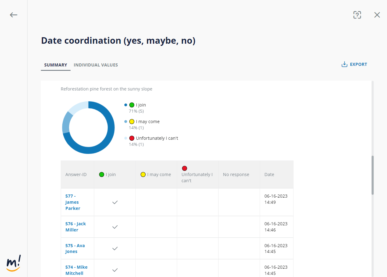 No matter what the form tool is used for, the feedback is automatically processed in a clear manner. In this way, organisers receive results quickly and easily - without having to evaluate them manually. Results can optionally be made available to all group members, e.g. for polls.