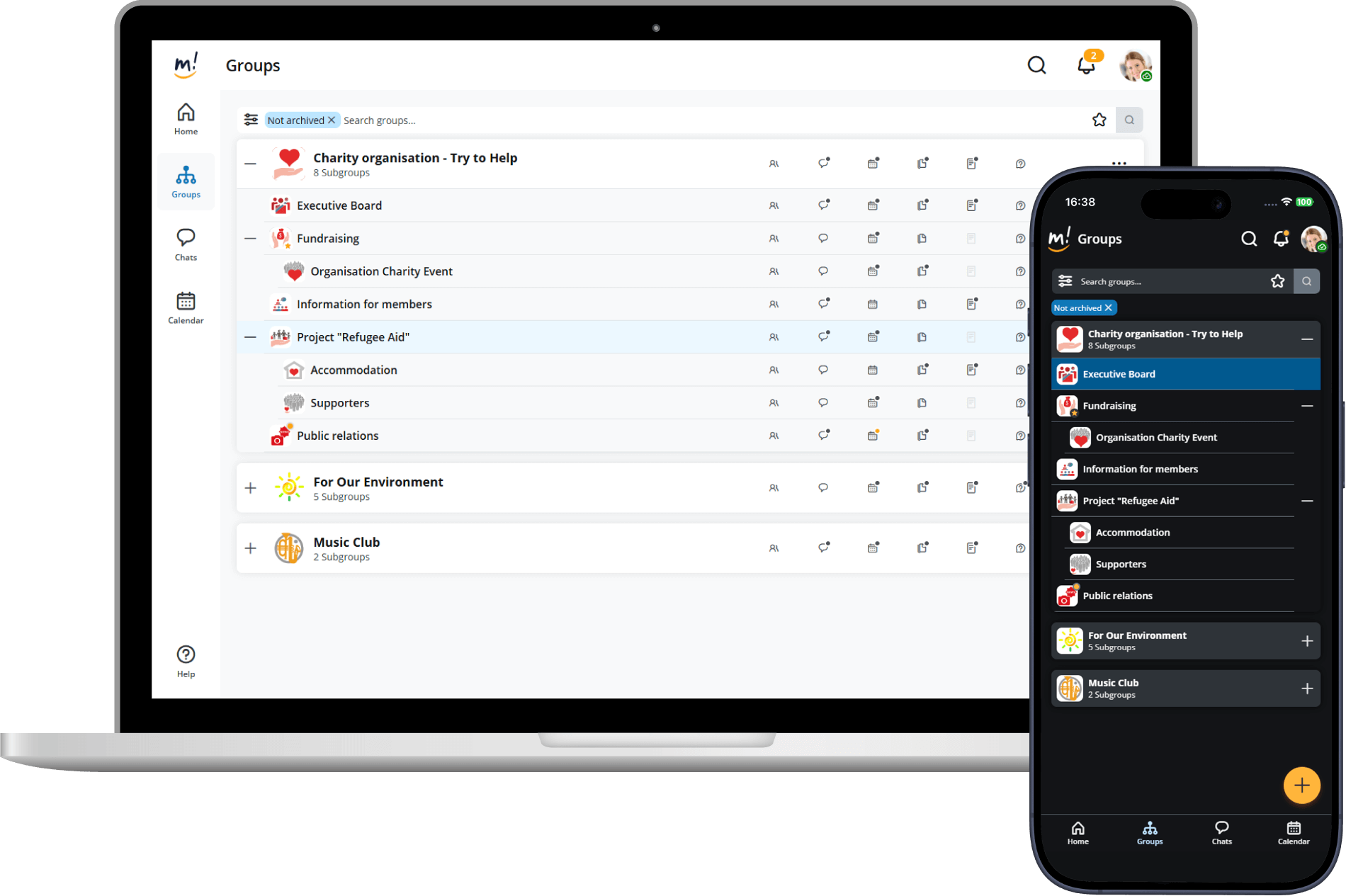 So, messages, events, and files are always found in the right context, and - step by step - a complete, comprehensible and clear structure of groups is created.