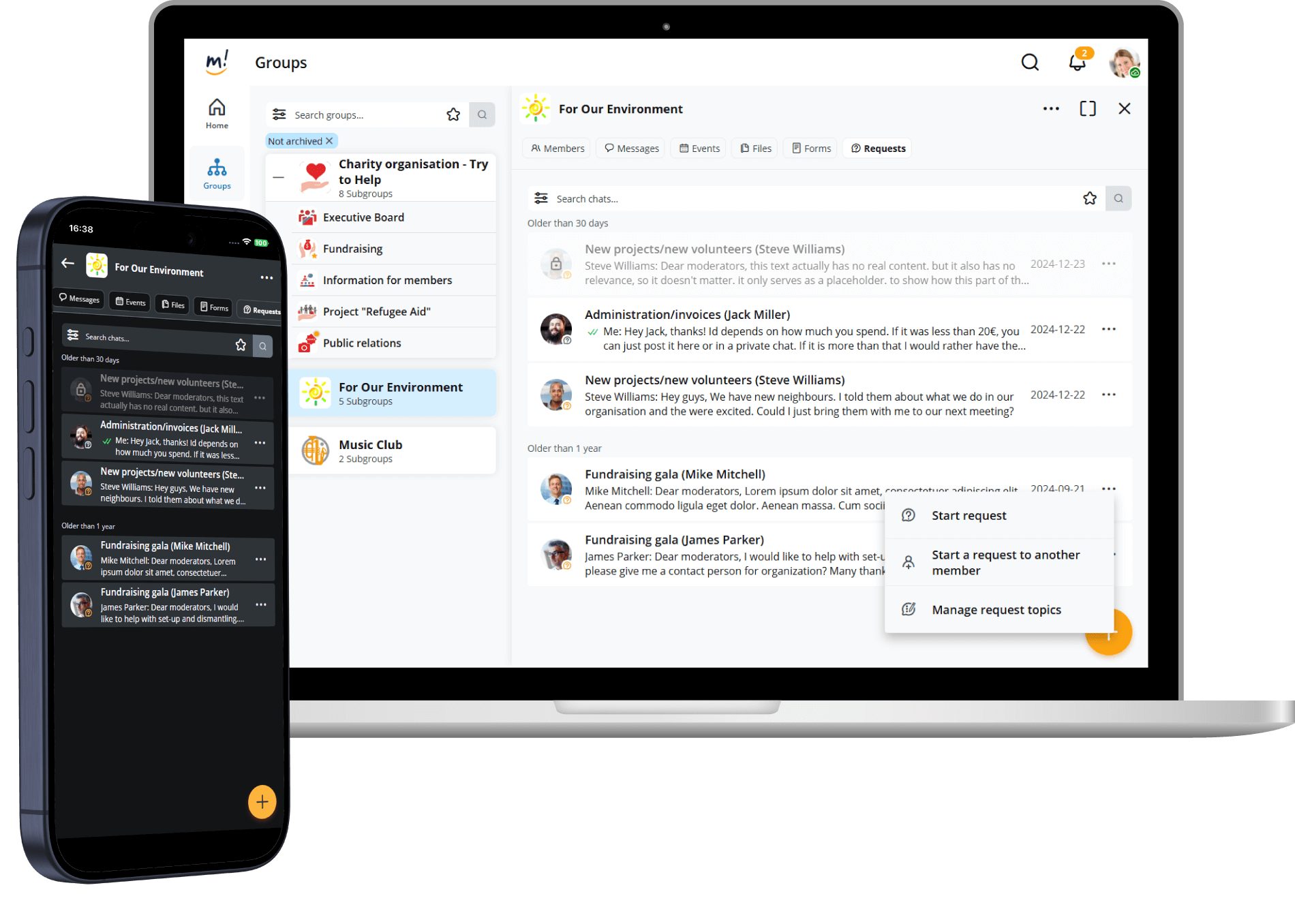 An ideal service channel can be set up with the "Requests" function. Not only the participants of a group can be looked after. With a "moderator team", even an entire community can be included.