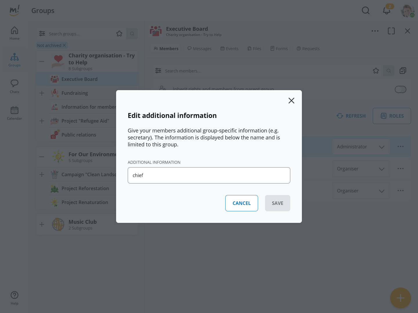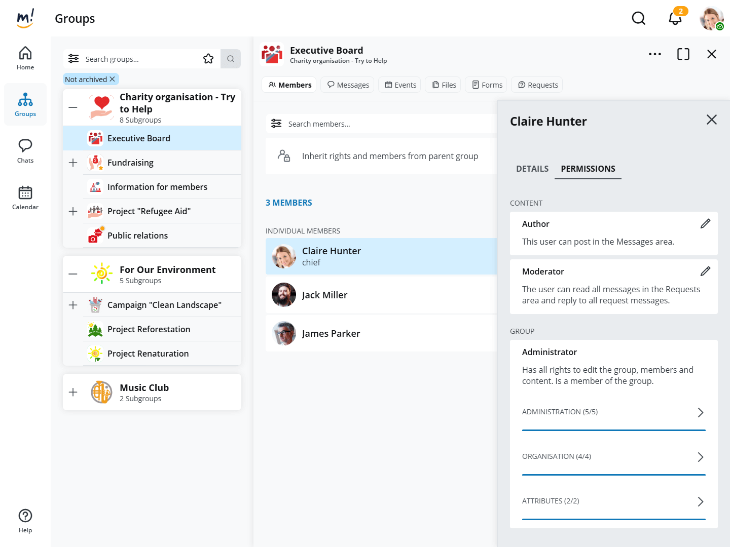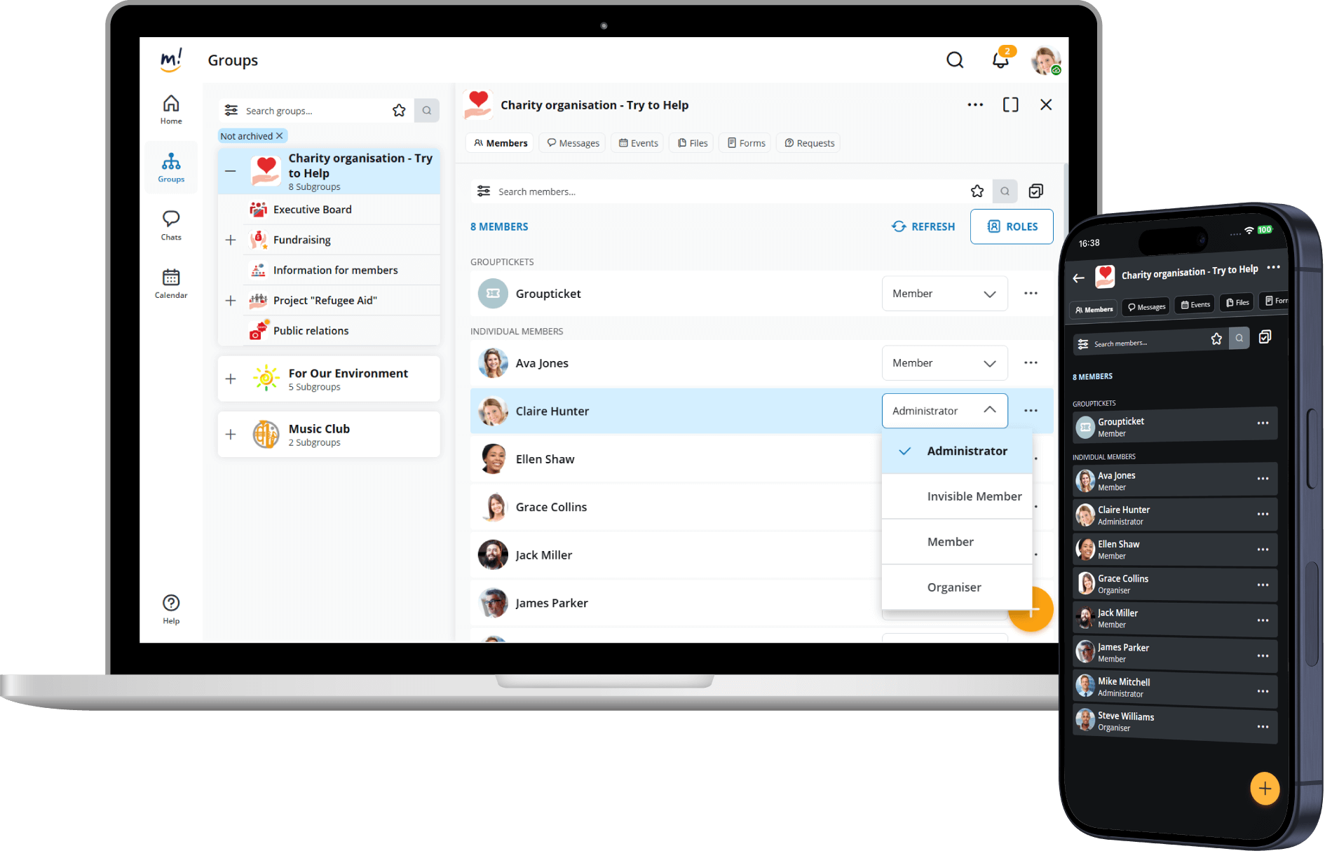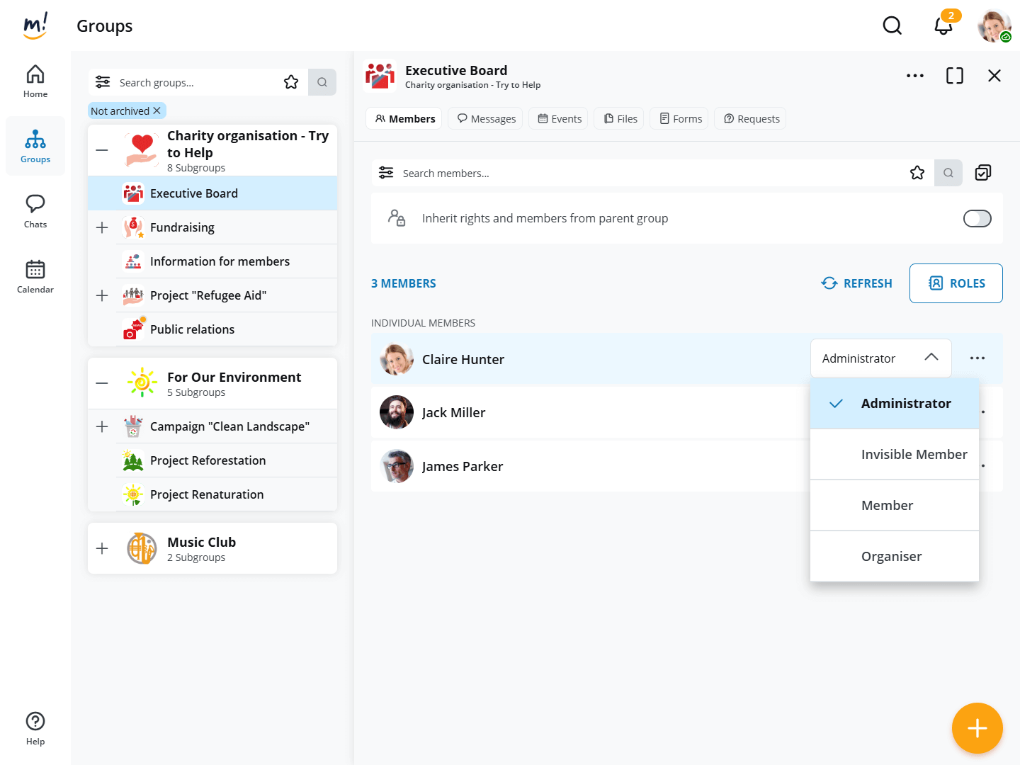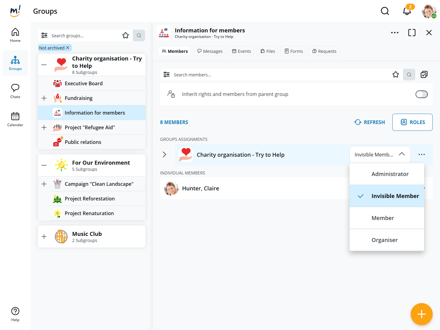 Members in a group are assigned roles, e.g. organiser, administrator or member. This is the task of the administrator and organiser of a group.
