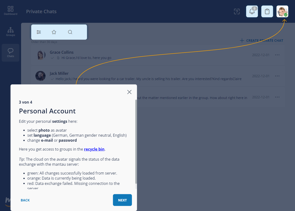 All groups and content are available everywhere and synchronously on all devices where you have mantau installed. Ideal for quick messaging on the way - as well as longer texting when using a computer. Ideal for hybrid work environments.