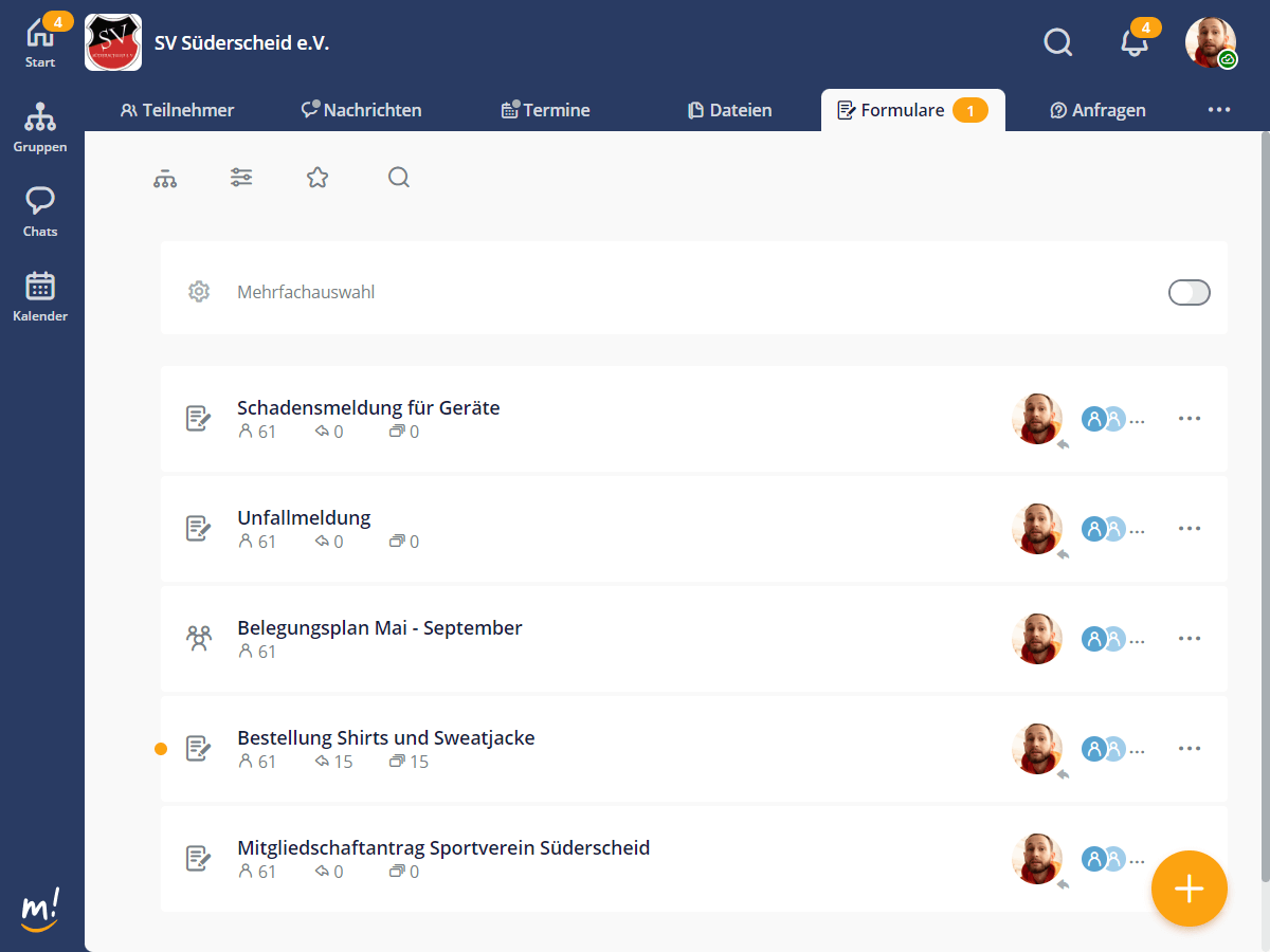 The universal form construction kit makes it easy to create digital forms, e.g. for orders, course registrations, data queries, accident and damage reports, participant registrations, to-do and shopping lists, surveys, votes and much more, in order to organise internal club processes smoothly, simply and in a structured manner for both the club management and the members.