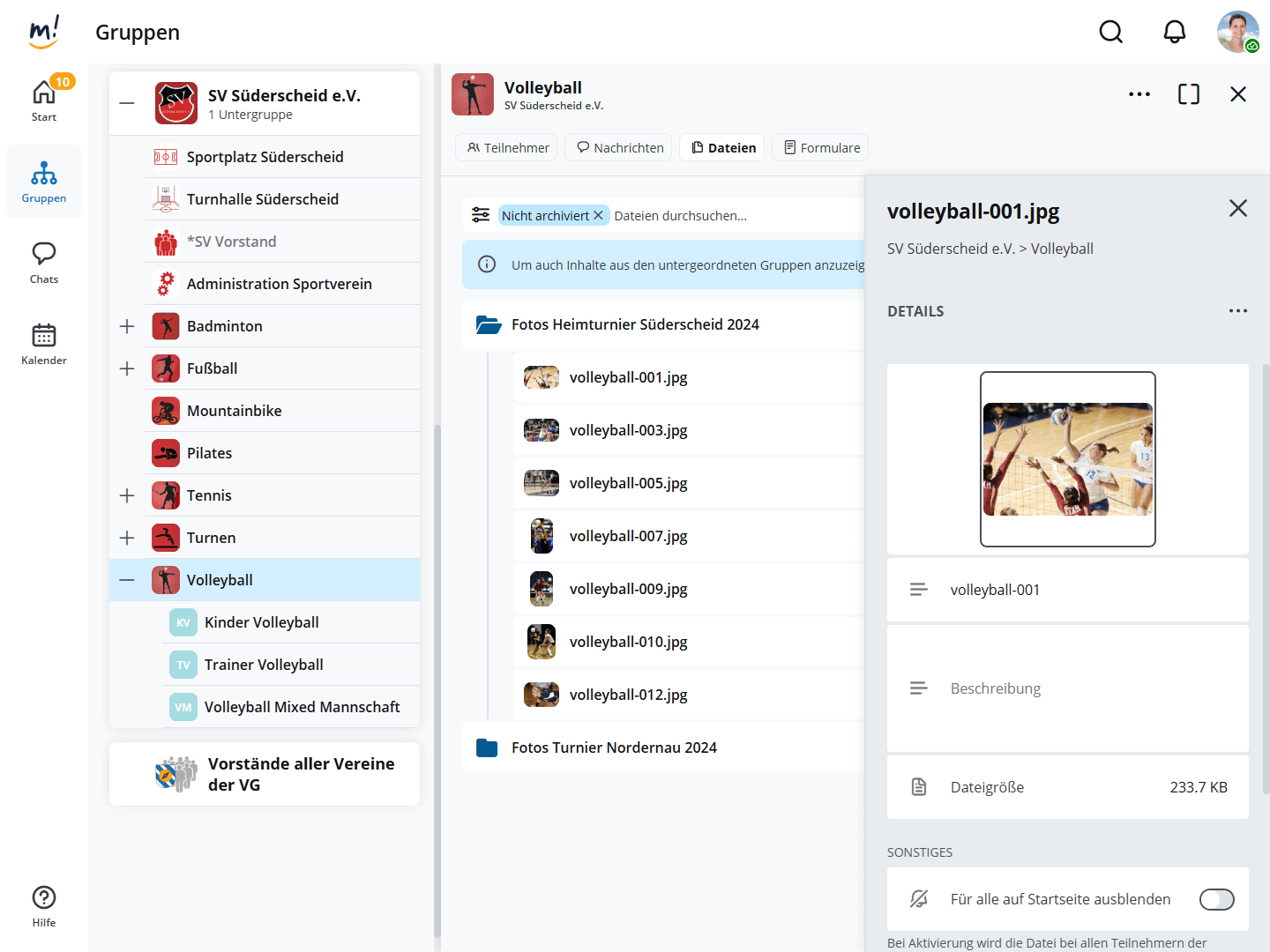 Shared documents, e.g. statutes, rules, minutes and much more, can be made permanently available within groups. Photos of events, honours, competitions or teams can also be shared or permanently stored in mantau.