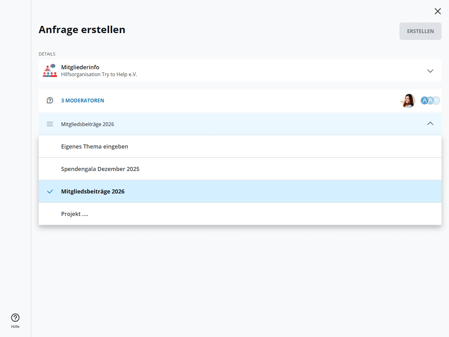 Der oder die Moderatoren bieten aktuelle Themen an, die Gegenstand von Anfragen sein können. Oder Sie ermöglichen es den Teilnehmern selbst, eigene Themen anzulegen. Das macht es für alle Beteiligten übersichtlich und effizient.