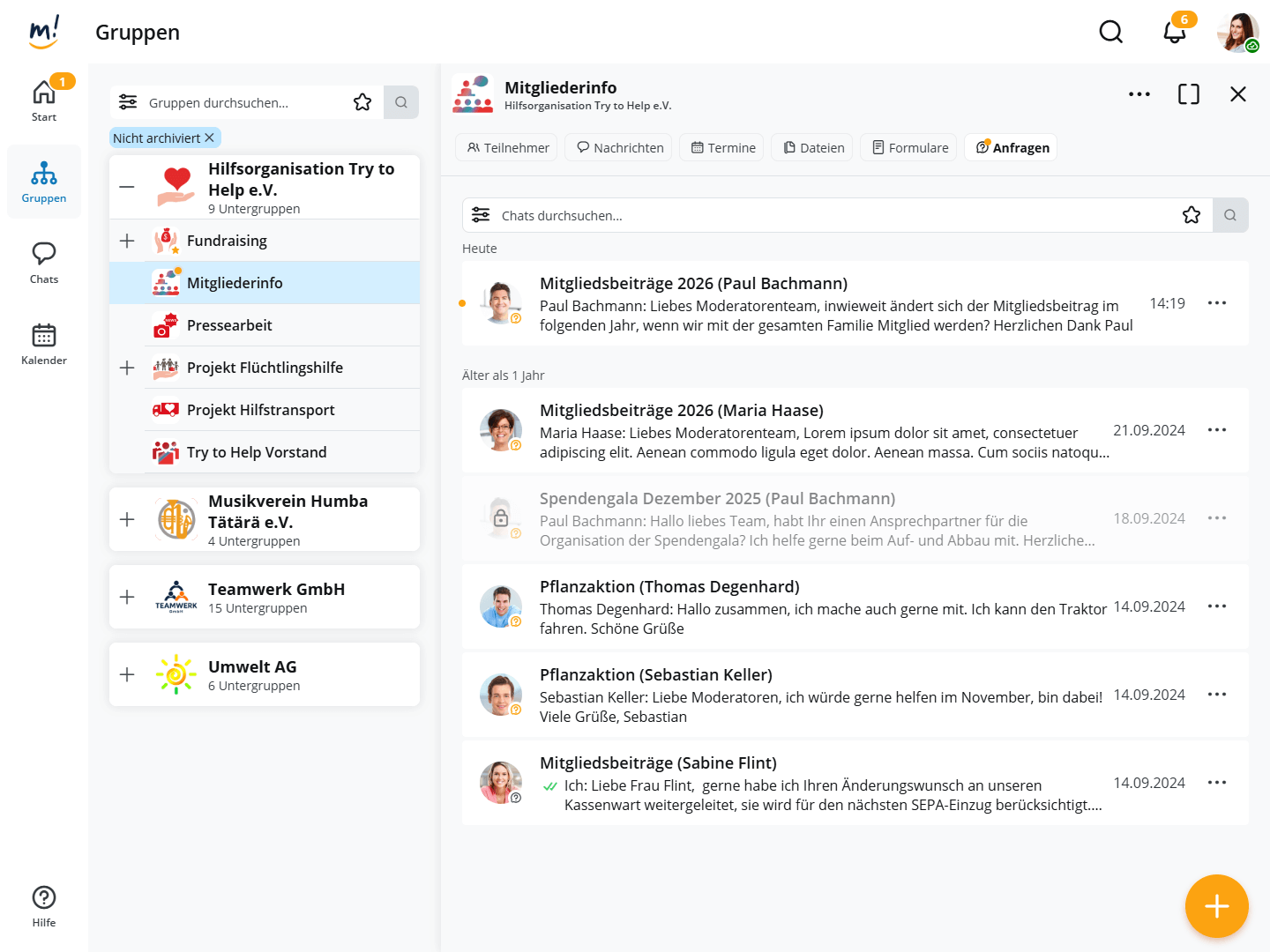 mantau bietet mit der Funktion "Anfragen" eine komfortable Lösung für Mitglieder einer Gruppe. Sie können mit einem oder mehreren definierten Moderatoren dieser Gruppe über themenbezogene Chats persönlich in Kontakt treten.
