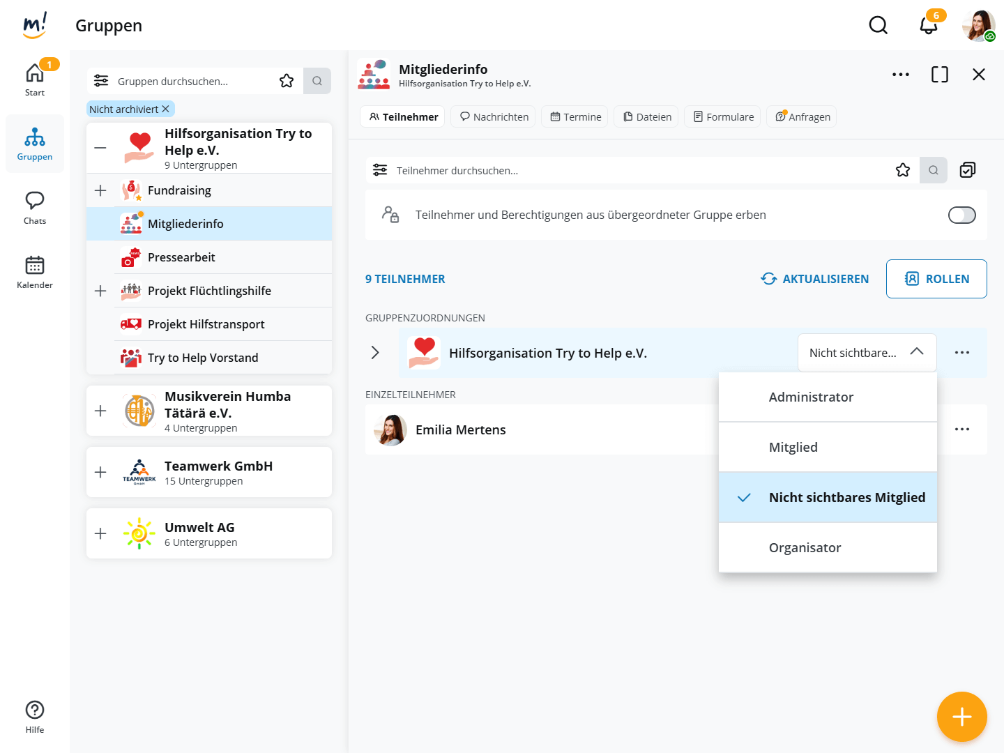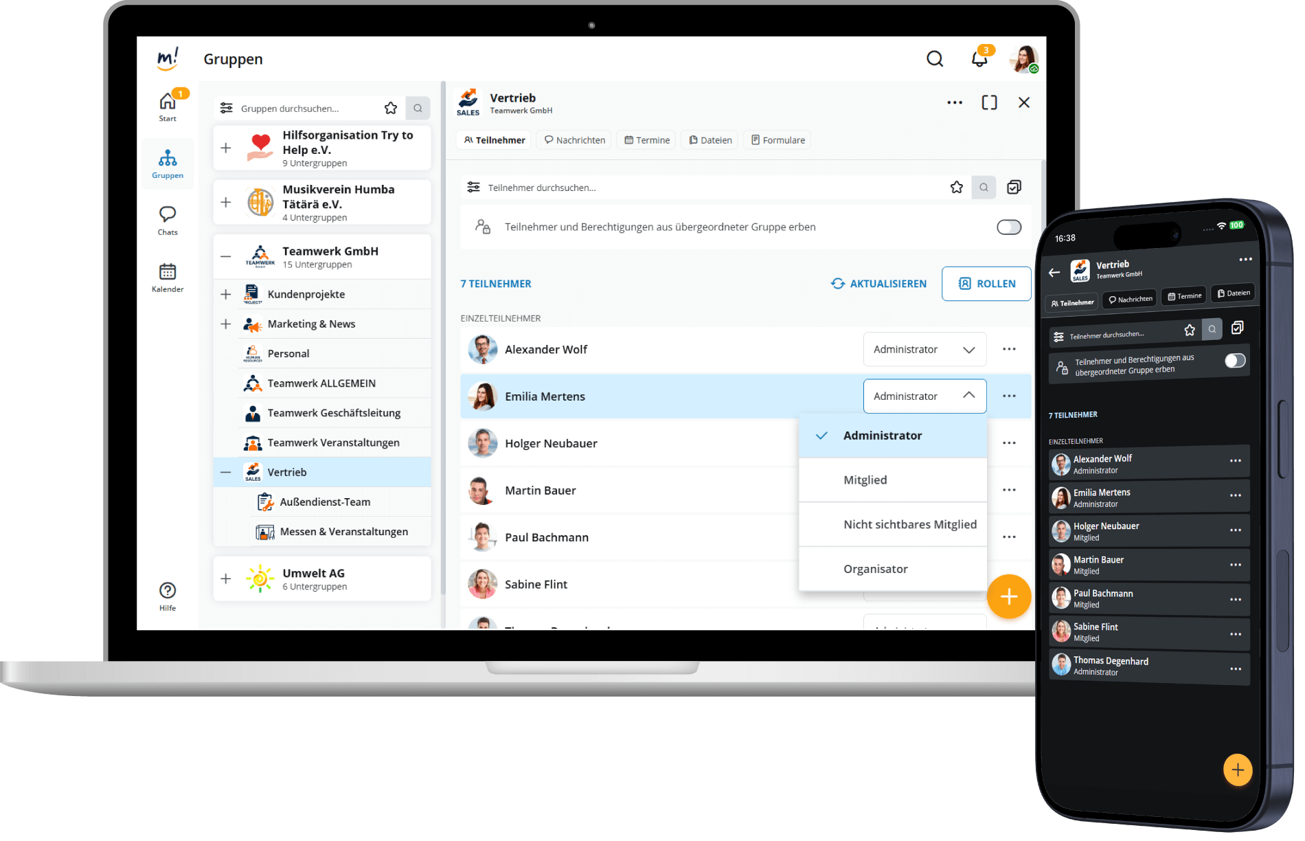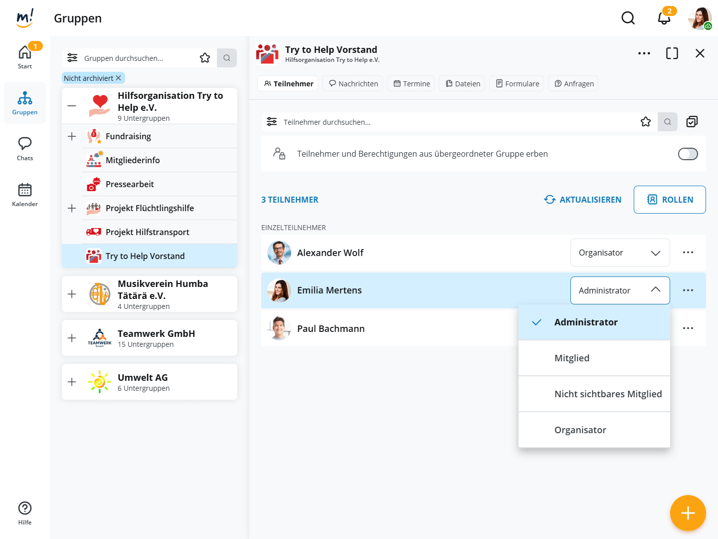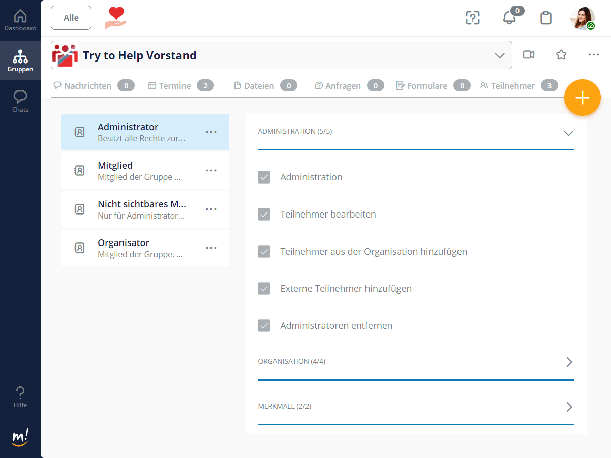 Teilnehmern einer Gruppe werden Rollen zugeordnet, z.B. Organisator, Administrator oder Mitglied. Das ist Aufgabe des Administrators und Organisators einer Gruppe.