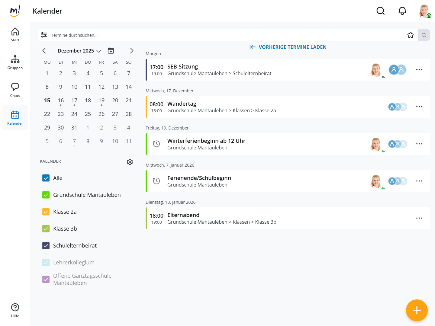 Termine ergeben sich für Sie als mantau-Nutzer in einzelnen Gruppen, in denen Sie teilnehmen, z.B. zu Veranstaltungen, Sprechtagen, Ausschüssen oder Konferenzen. In Ihrem persönlichen Terminplaner erhalten Sie Übersicht über all Ihre Termine, über alle Gruppen hinweg. Egal, ob schul-interne Termine oder öffentliche, Sie sehen alle Termine in einer gemeinsamen Ansicht.