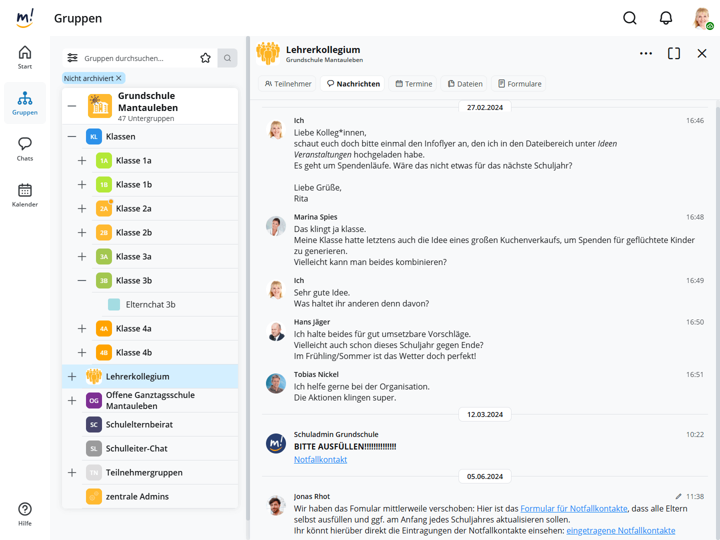 Die übersichtliche Gruppenstruktur sorgt für klare Kommunikationswege. Jeder Nutzer sieht nur die Gruppen in mantau, an denen er teilnimmt.