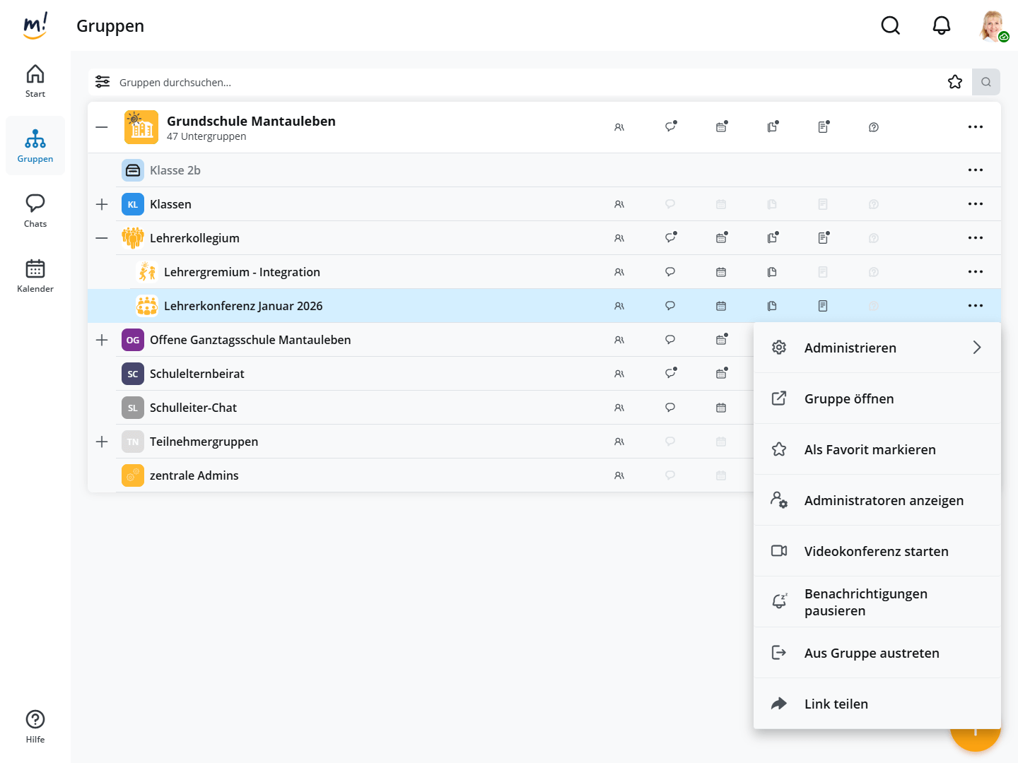 Organisieren Sie Ihre interne Kommunikation unter Lehrenden per App. Gruppen können sich beliebig zusammenfinden und durch Rechtevergabe auch selbst organisieren, z.B. nach Fachbereichen, Klassenstufen, Leitungsbereichen.