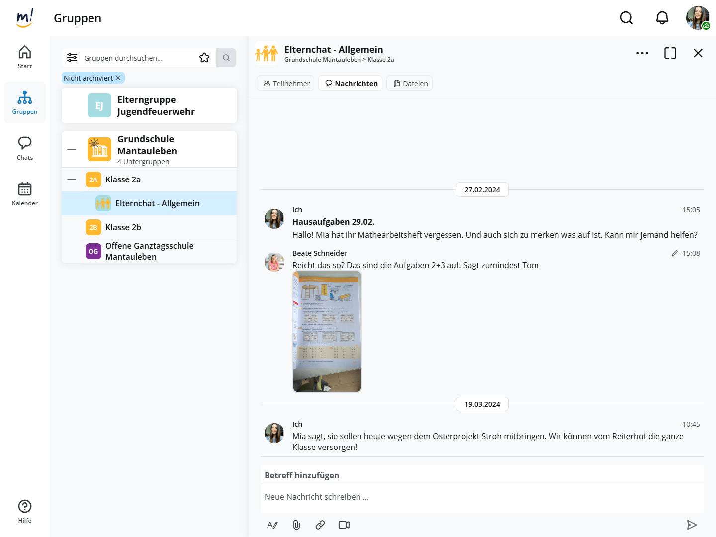 - Weitere Untergruppen für bestimmte Zwecke und Teilnehmer, z.B. für Hausaufgaben-Fragen, Veranstaltungsorganisation, Elternsprecher-Kommunikation, sorgen für Übersicht in Chat-Verläufen und ein entspannteres Miteinander.