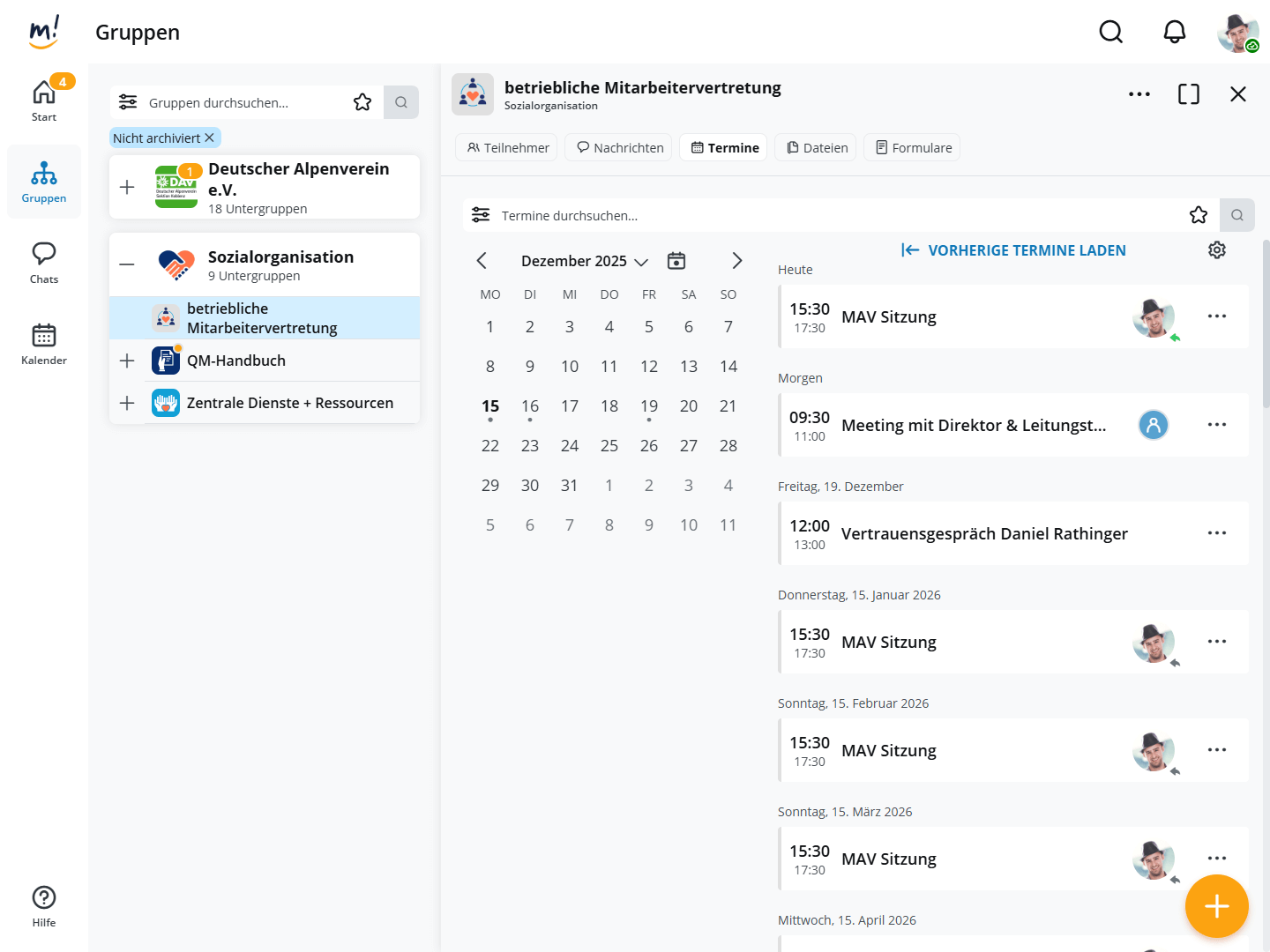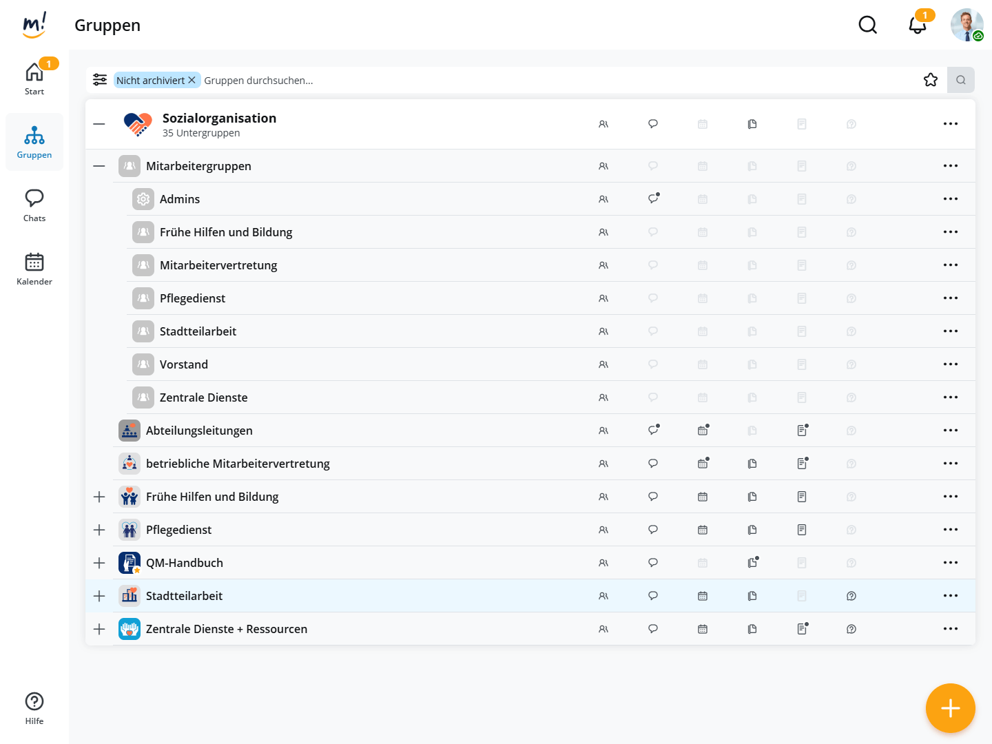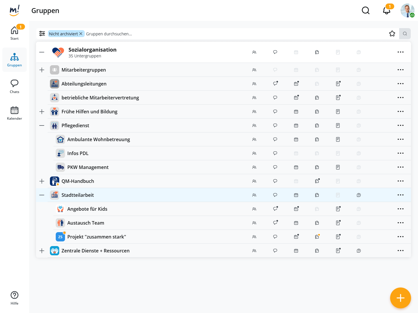 Für eine breit aufgestellte Organisation mit unterschiedlichen Leistungsangeboten und ggf. vielen Standorten gilt es, viele Gruppen an Beschäftigten digital möglichst ideal in Beziehung zu setzen. mantau liefert hier die passende Lösung. Mit der App kann die Gruppenstruktur einer Sozialorganisation mit vielen Abteilungen, Teams und Hierarchien exakt abgebildet werden.