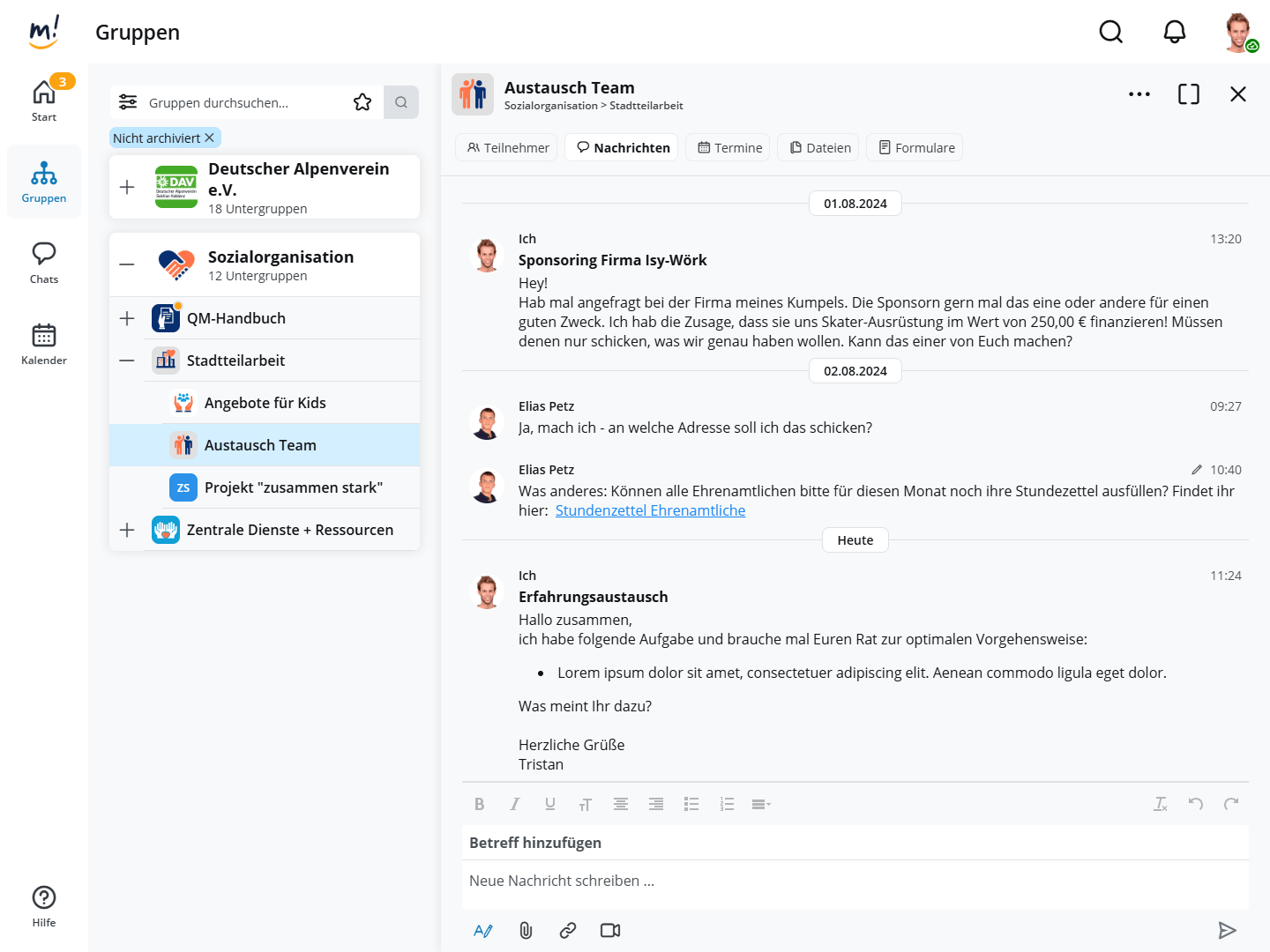 Leitung, hauptamtliche Mitarbeiterinnen und Mitarbeiter, Gremien sowie alle ehrenamtlich Tätigen werden über mantau miteinander vernetzt. Die Kommunikation und Zusammenarbeit erfolgt einfach, übersichtlich und geordnet in diesen Gruppen, damit effizienter und stressfreier, als bislang per E-Mail oder anderen Hilfsmitteln. Und das über unterschiedlichste Endgeräte.
