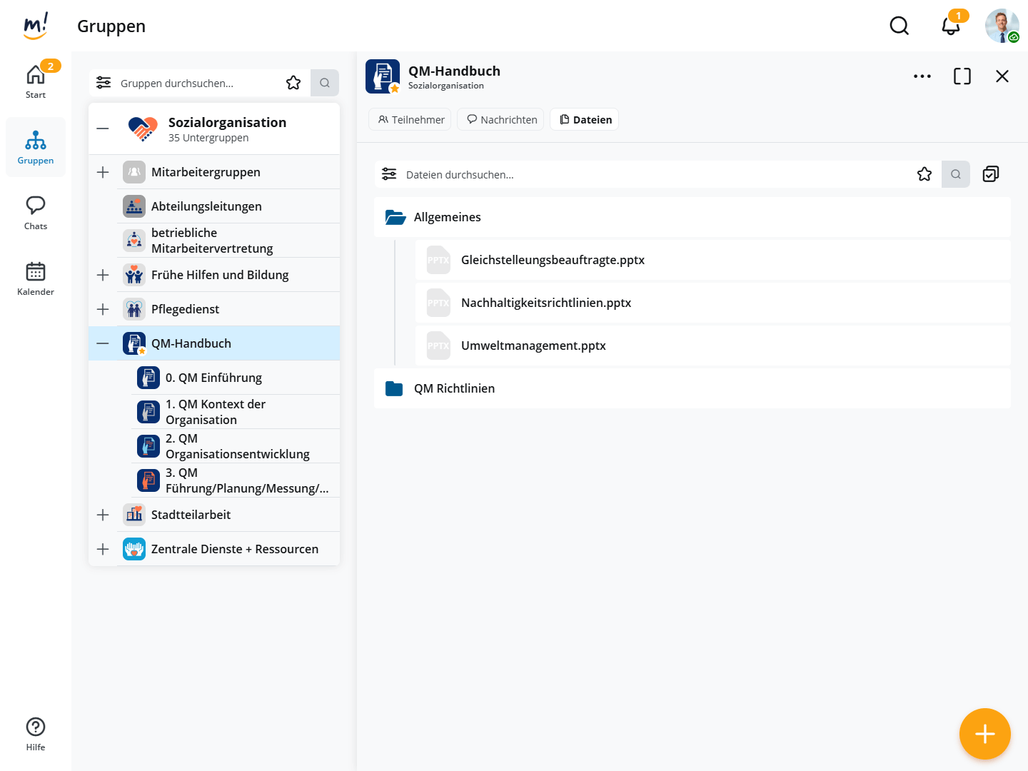 Die Strukturierung in eine individuelle Anzahl und Ebenen von Gruppen und weiteren Untergruppen ermöglicht einer großen Organisation, dass alle Bereiche und deren Mitarbeiter jederzeit und von überall aus Zugriff auf die für sie relevanten Dateien und Dokumente haben. So lassen sich beispielsweise alle Inhalte eines digitalen „QM-Handbuchs“ zielgenau zur Verfügung stellen, was nicht zuletzt der Qualitätssicherung zugutekommt.