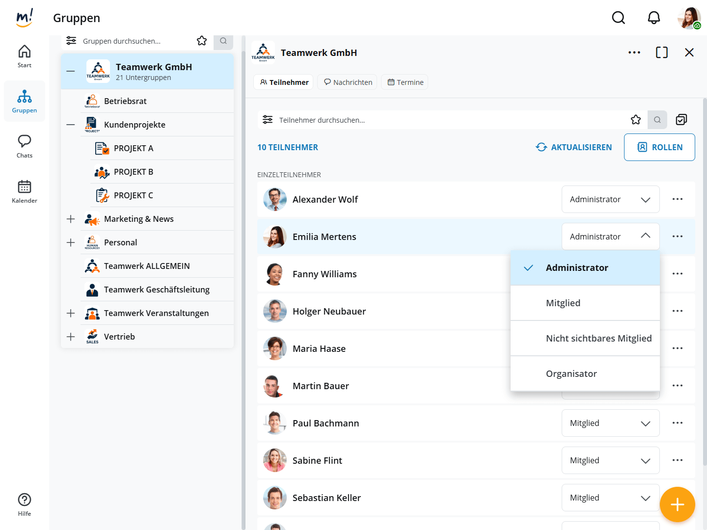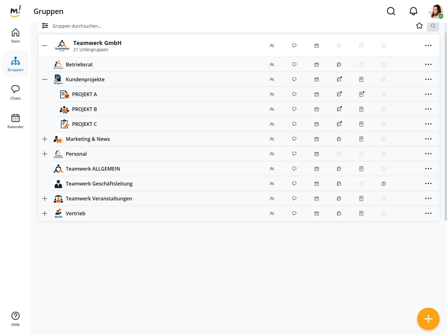 Mitarbeitende sehen nur die Gruppen, die für sie relevant sind. Die strukturierte Übersicht sorgt für Transparenz, Ordnung und schnelle Orientierung. So behalten Teams jederzeit den Überblick über Abteilungen, Projekte und Informationsgruppen.