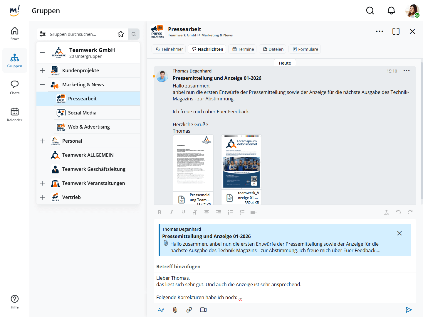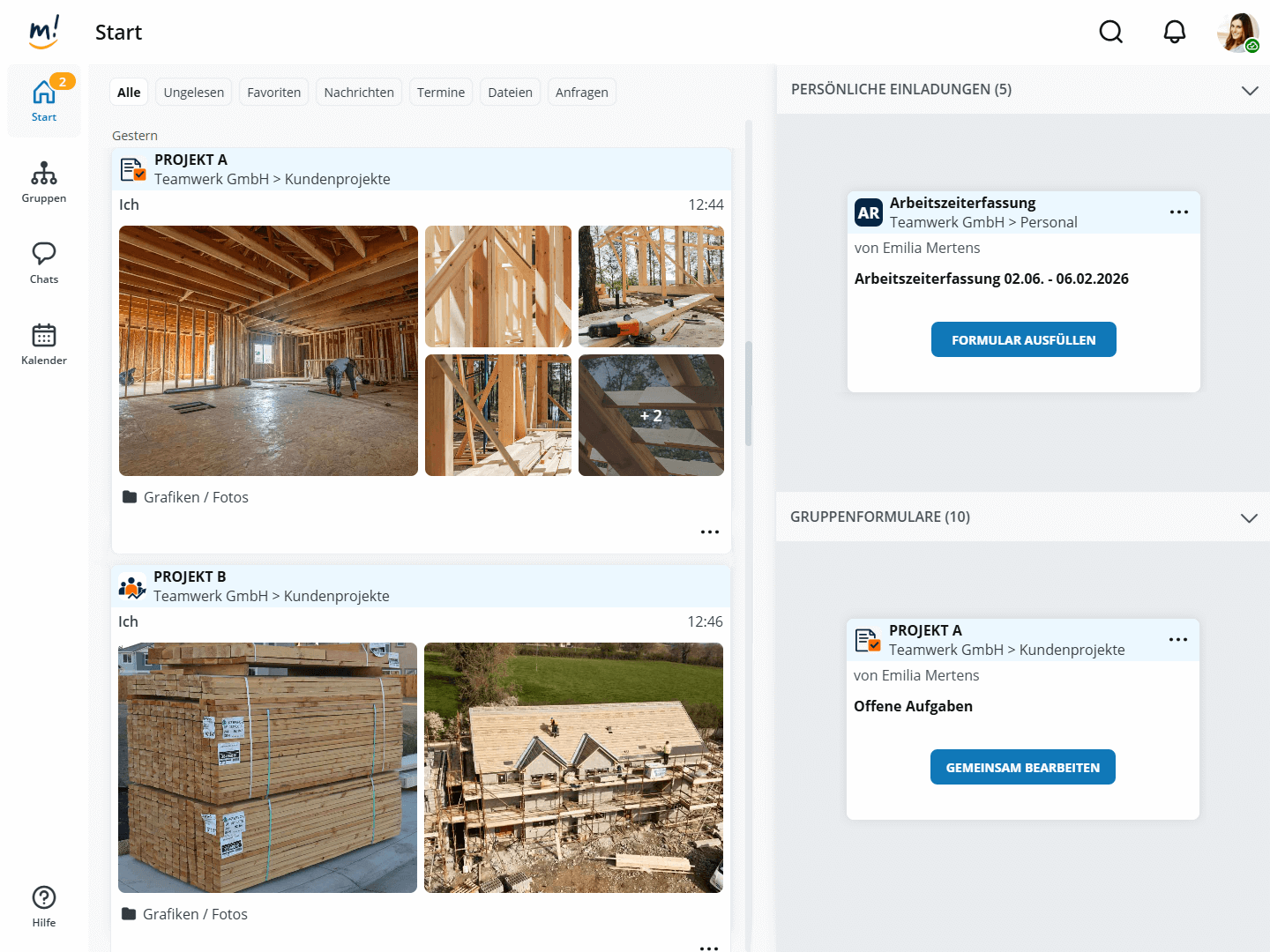 Interne Kommunikation und Projektabstimmungen laufen zentral über eine gemeinsame Plattform – digital, unkompliziert und effektiv, unabhängig von Standort oder Endgerät.