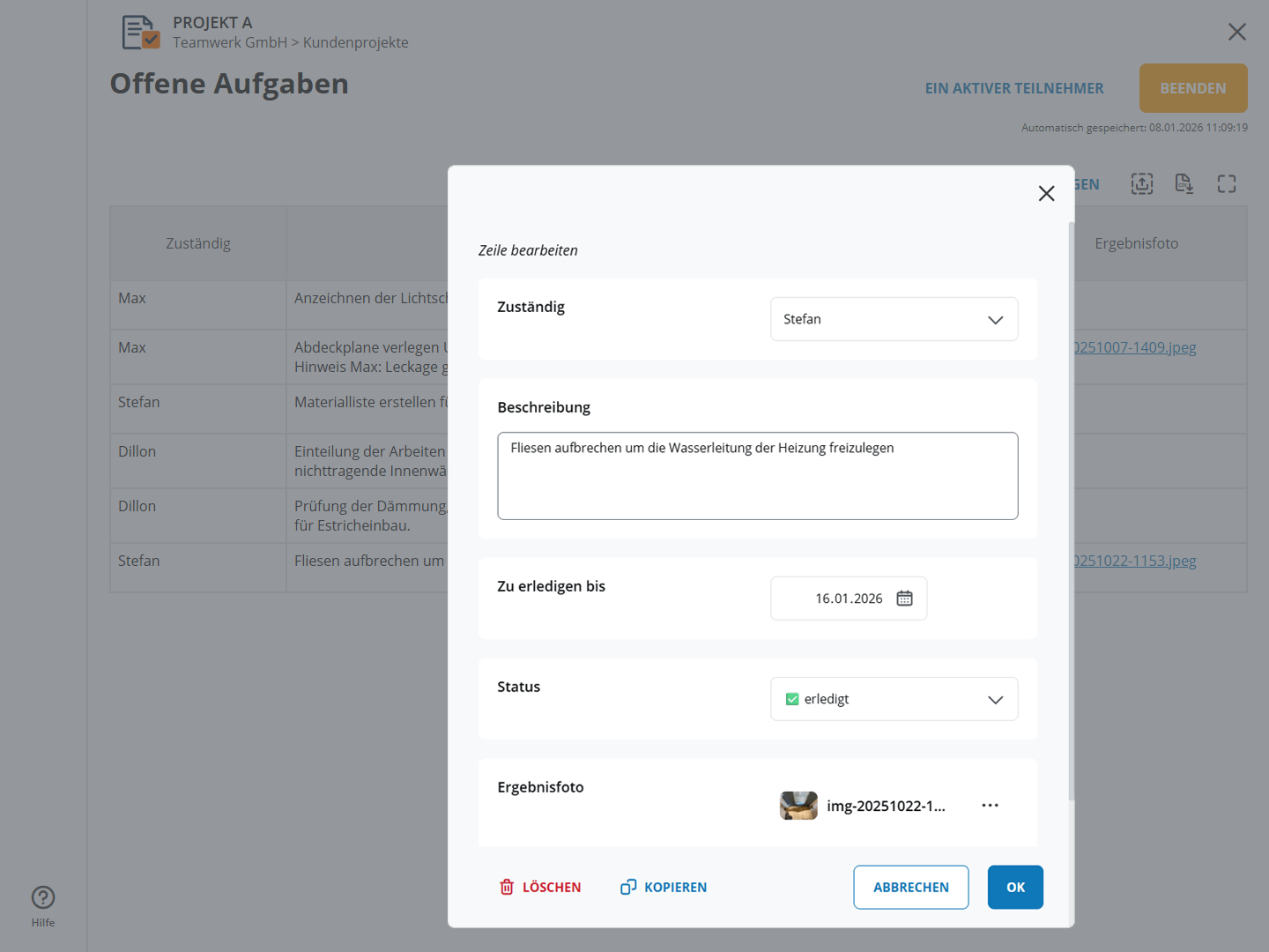 mantau erleichtert die abteilungsübergreifende und zeitlich begrenzte Zusammenarbeit in Kundenprojekten oder internen Projekten. Aufgaben lassen sich digital verteilen und nachverfolgen, Protokolle, Checklisten und Projektunterlagen zentral bereitstellen, sie stehen den Teammitgliedern jederzeit zur Verfügung. Das reduziert Doppelarbeit und spart Zeit bei der Suche nach Dokumenten.