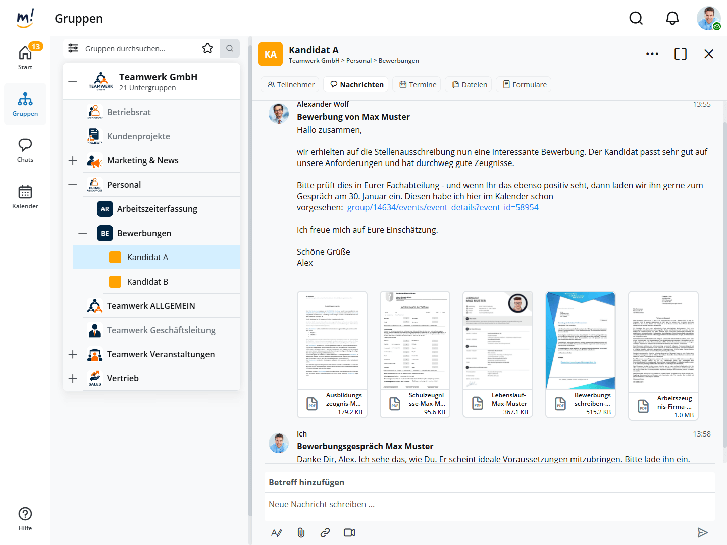 Dezentrale Administrationsmöglichkeiten gewährleisten, dass vertrauliche Inhalte nur für berechtigte Gruppen zugänglich sind. Geschäftsführung, Personalabteilung, Gremien oder Betriebsrat können sensible Daten sicher austauschen, ohne dass Unbefugte Zugriff haben.